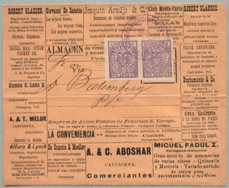 1902, 5 cents, violet, without overprint, pair, CORREOS NACIONALES - CARTAGENA - 30.7.02, in violet, on advertising cover, sent within the city, Ex Provera, XF! Schätzpreis 300€.