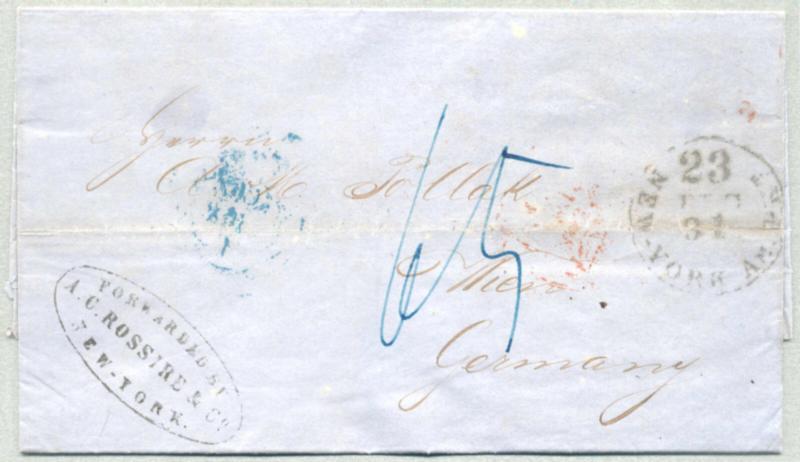 1864, stampless forwarded letter from HAVANA via NEW YORK to WIEN, falsly written to Germany, nevertheless the letter arrived in VIENNA, cancel NEW YORK 23 DEC, m/s 65 (Cents), smudged AACHEN and black oval FORWARDED BY AC ROSSIRE & CO NEW YORK, reverse with red arrival WIEN and blue AACHEN 16 1 tra