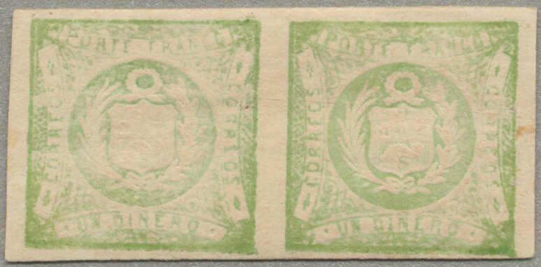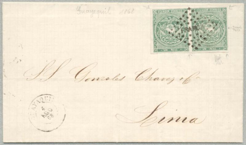 1868, 1r, green, imperf, pair, small plate errors, double pearl on right side of right stamp, on cover from GUAYAQUILL to LIMA, cancelled with dotted FRANCA Lozenge cancel, aside cds GUAYAQUIL 4 AGO 68, reverse with arrival LIMA 8 AGO 68, cert. and signed Holcombe, ex Provera, a fine and scarce cove