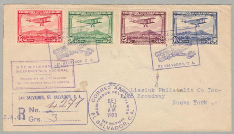1930, Registered airmail cover from San Salvador to New York, franked with a complete set of the 1930 El Salvador airmail issue (15c red, 20c green, 25c violet, 30c brown, and 40c blue), each depicting a Curtiss biplane over a landscape. Cancelled with a neat 15 SEP 1930 CORREO AÉREO / REGISTRADOS D