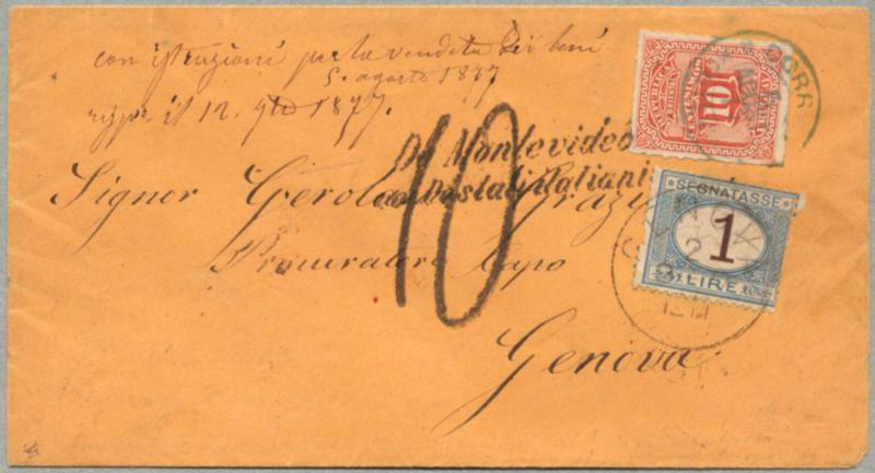 1877, Italian post office in Uruguay, 10 Centesimos of Uruguay + 1 Lire of Italy, on letter from MONTEVIDEO/Uruguay to GENOVA/Italy, cancelled CORREOS MONTEVIDEO 6 AUG 77, 1 Lire with GENOVA 2 9 -77, aside line Da Montevideo coi Postali Italiani, upon arrival the letter was taxed 10 Decimes which wa