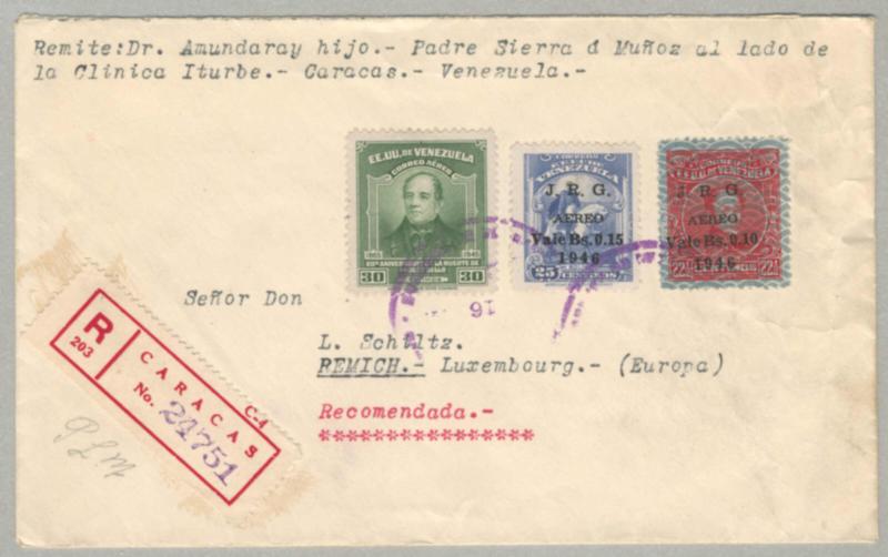 1947, 10+15+30c, Airmail stamps on registered letter from Caracas to Remich in Luxembourg, violet cancel, reverse with Remich and Luxembourg arrival, fresh letter, XF! Schätzpreis 200€.