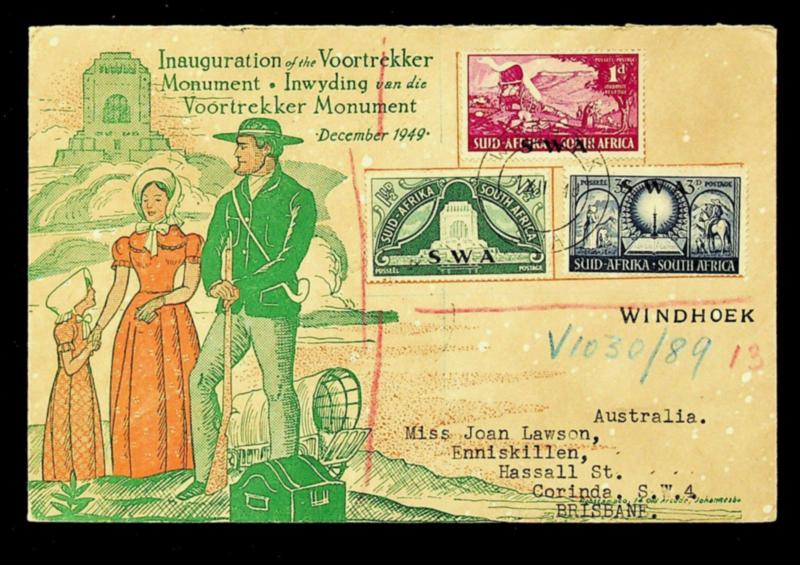 South West Africa ovpt on South Africa 3v 1949 Voortrekker Monument inauguration cover from Windhoek to Brisbane, Australia