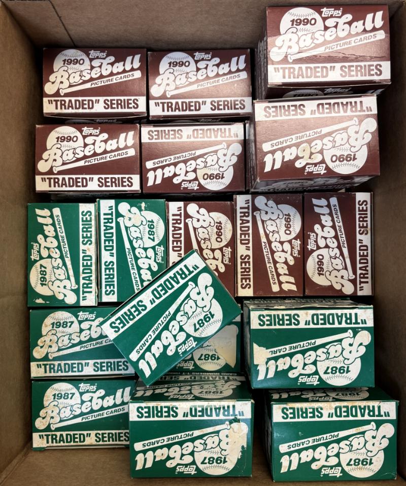 Accum (40) Topps traded sets incl (20) 1987 sets incl Maddux & McGriff rookies & (20) 1990 sets; ea set contains (132) cards; a few boxes stuck together; gen NRMT-MT