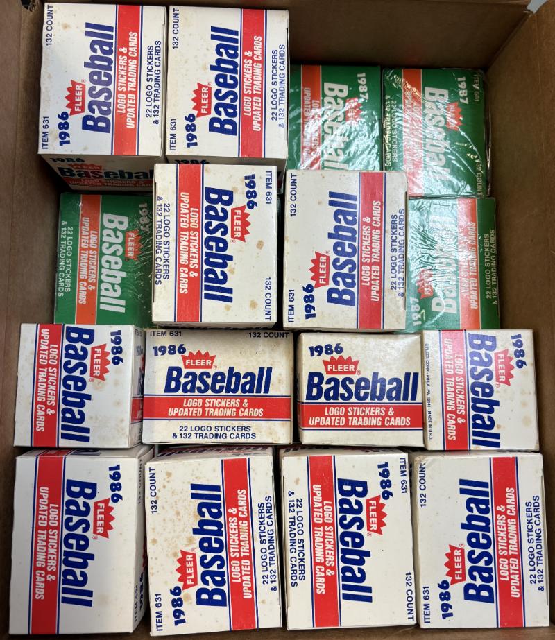 Accum (40) factory sealed baseball update sets incl (20) 1986 Fleer Updated Sets w/ Bonds & W Clark rookies; (20) 1987 Fleer Updated Sets w/ Maddux & McGuire rookies; ea set contains (132) cards & (22) logo stickers; gen MT