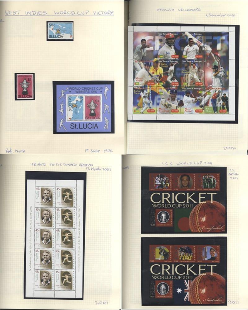 CRICKET collection of modern sets, M/Sheets, sheetlets, booklets, FDC's together in three Devon albums. Colourful lot for the Cricket enthusiast.