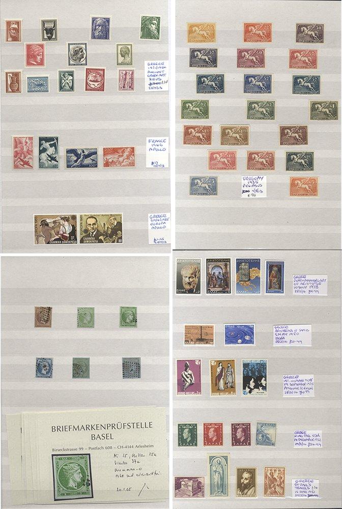 GREEK MYTHOLOGY large stock book with M or UM & U stamps mainly from Greece but includes other countries, highlights incl. some better Greece sets - 1935 Mythological Designs set UM, Cat. £100, 1951 St. Pauls set UM, Cat. £300, 1953 National Products set M, Cat. £130, 1954 Ancient Greek Art set UM,
