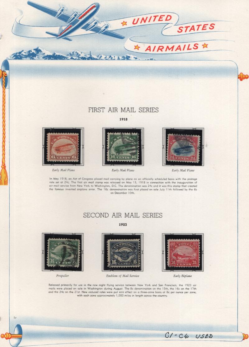 AIRMAIL Collection dozens 1918-80 in W/A album incl Unused: C7-9 NH, C11-12 NH, C13 NH, C14, C18 NH, C25-31 NH singles & Blks; Used: C1-6; C6 thin, o/w Avg-F to VF