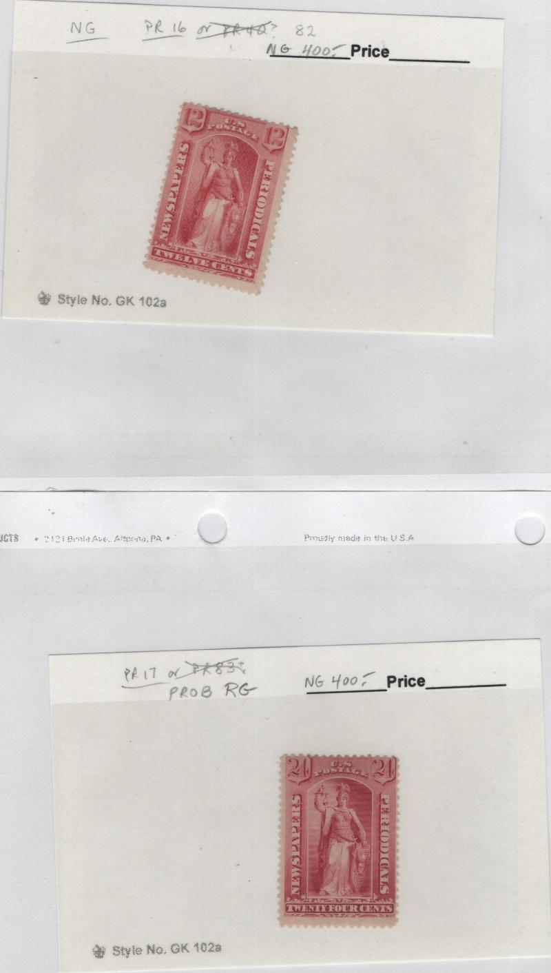 NEWSPAPERS & PERIODICALS */O Group(15) on approval cards, IDed dealer pgs incl Unused: PR5-6 (need Certs), PR16 NG, PR17 NG, PR116 NG, PR118 & Used: PR117 flts, PR120-22 & facsimiles PR2, PR3, PR6 (2); cond varies, flts to most sound, Avg-VF, gen Fine to F-VF