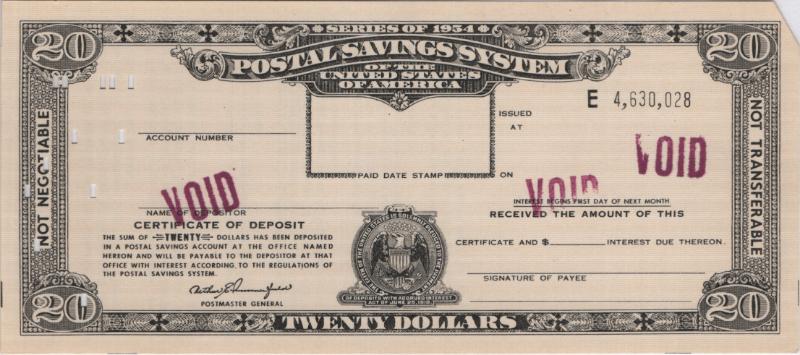 POSTAL SAVINGS, three unissued Certificates of Deposit, series 1954, Summerfield signature, $20, $50, $100; each w/ violet R/S "void", $50 & $100 w/ R/S Great Neck NY