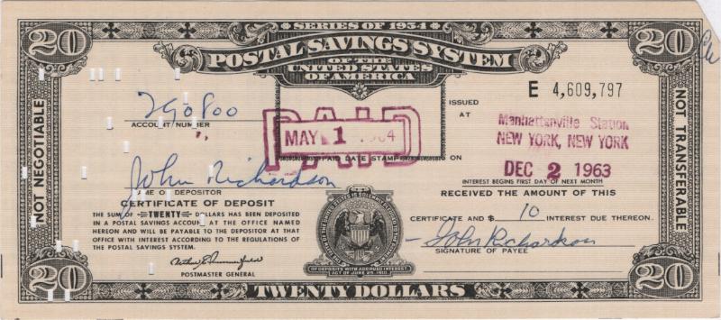 POSTAL SAVINGS, three issued & redeemed Postal Savings Certificate of Deposit, series 1954; $20 & $200 w/ PMG Summerfield signature, $50 w/ PMG Gronouski signature; $20 issued at Manhattanville Station NY, $50 at College Station NY, $200 at Knickerbocker Station NY; $200 has slight CCr at LR