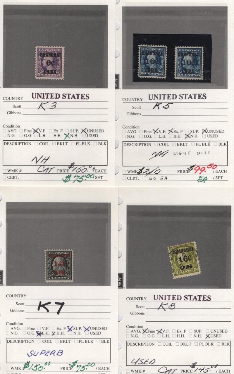 SHANGHAI OVPTS Dealer Stock incl Unused: K1 (4 NH, 1 HR), K2 (1 NH, 1 LH, 1 HR), K3 (1 NH, 2 LH, 1 H), K4 (1 NH, 1 H, 1 HR), K5 (5 LH, 1 H), K6 (1 HR, 1 thin), K7 (1 LH, 1 H, 1 HR, 1 tone spots), K8 (2 DG, 2 HR), K9 (1 H, 1 HR), K10 HR, K11 HR, K12 HR, K13 (1 NH, 1 LH, 1 HR), K14 (1 LH SE, 2