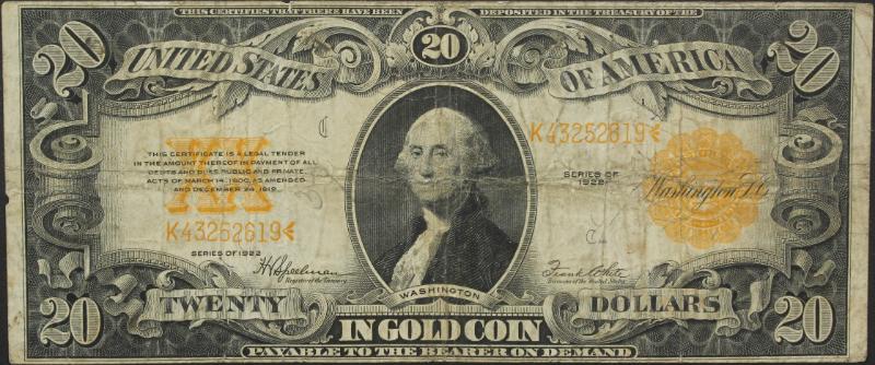 1922 $20 Gold Certificate F-1187 S/N K43252619 VG