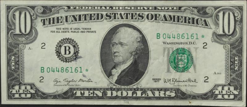 Complete Face Offset Transfer on a 1977 $10 FRN (NY) *Star* Note. The note is circulated (XF) but maintains a fairly vivid offset transfer. Offset transfer errors are not particularly rare but what distinguishes this one is that it appears on a *Star* note. Unusual and interesting!