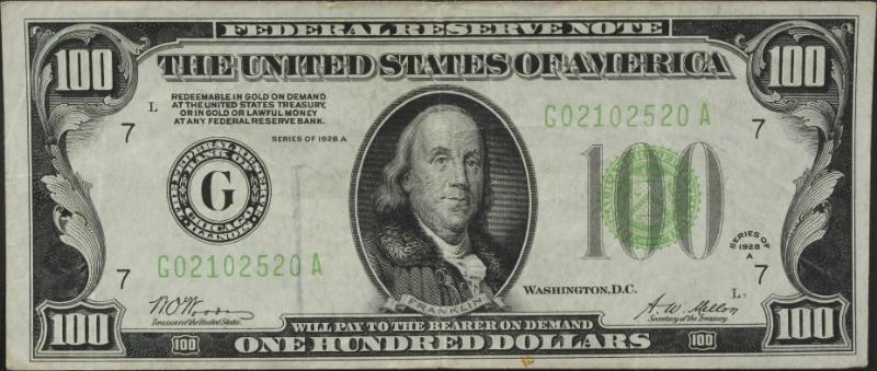 1928A $100 FRN (Chi) Light Green Seal F-2151 F+ w/ a light teller stamp on the face o/w well-centered and attractive.