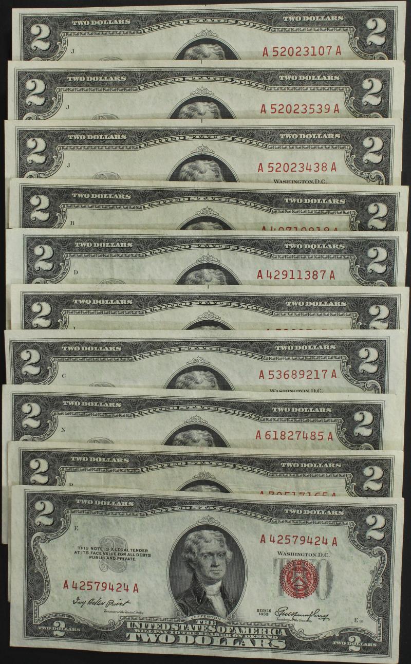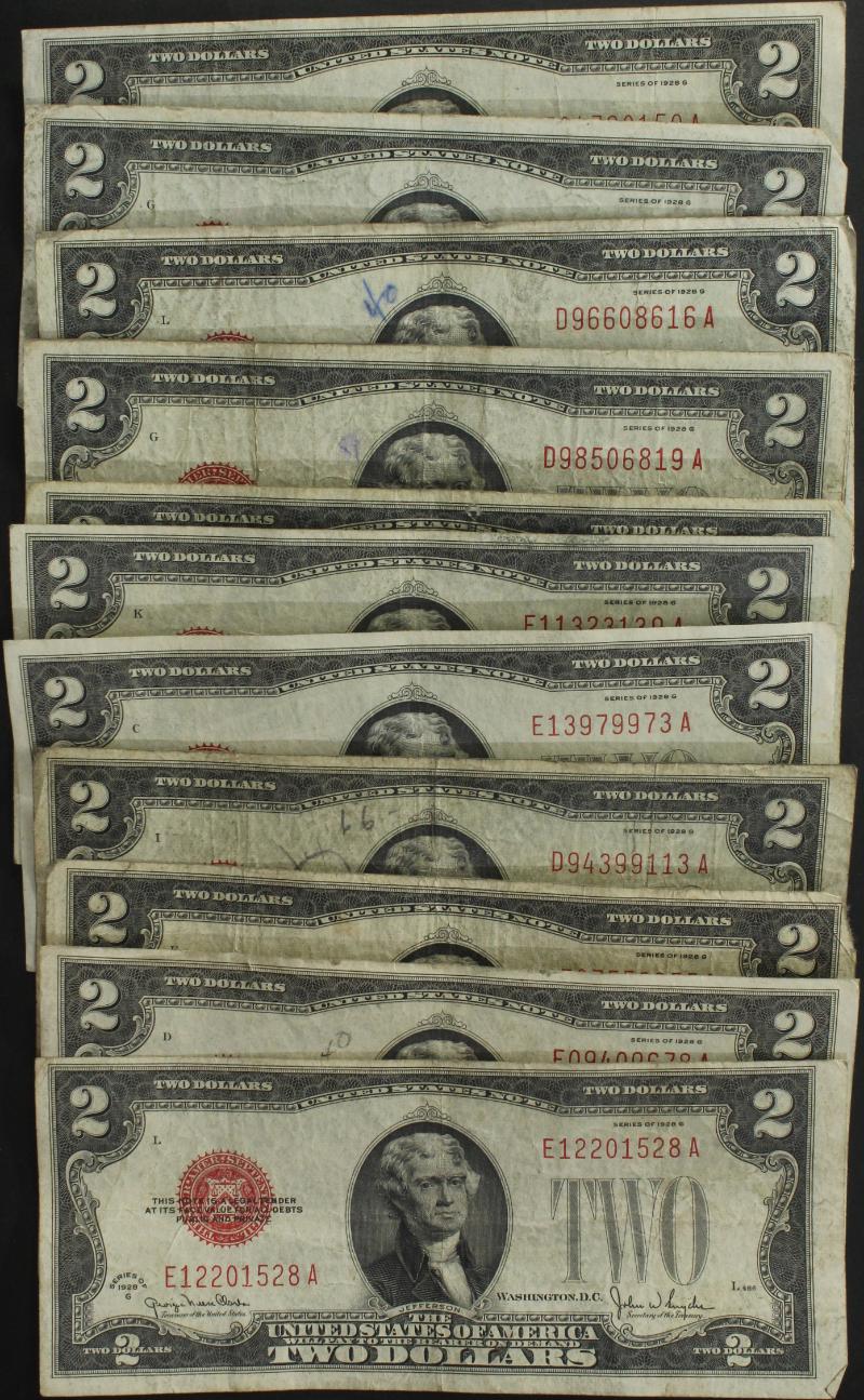 (120) $2 Red Seals all 1928A // 1963 F-1502 to F-1513 avg circ sev w/ ink, missing corners, and other imperfections but overall a sound group. ($240 face)
