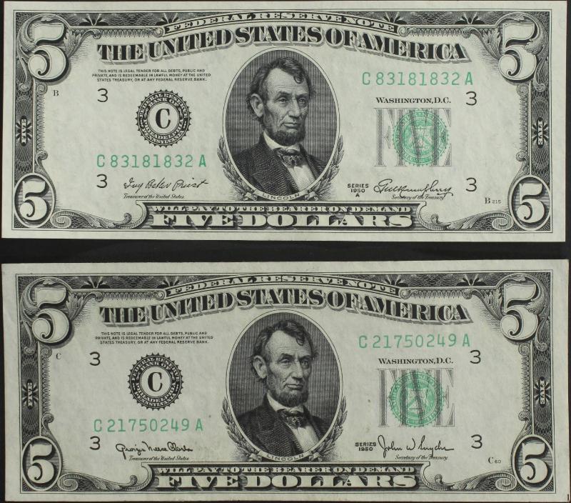 $60 face in early FRNs incl (2) $5: 1950 & 1950A (both Phi) F-1961c and F-1962c, and (5) $10: 1934 & 1934A (all Phi) F-2005c and F-2006c. Beautiful Ch CU notes w/ (2) sets of consec S/N among the $10s.