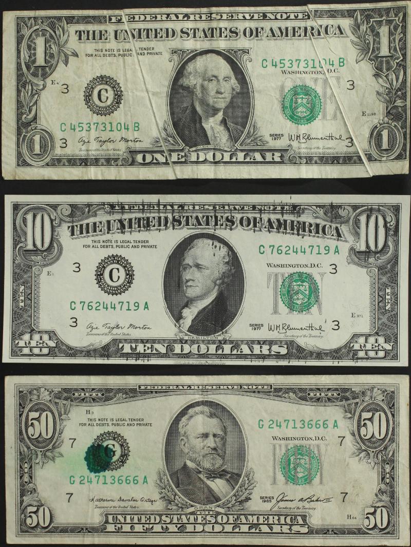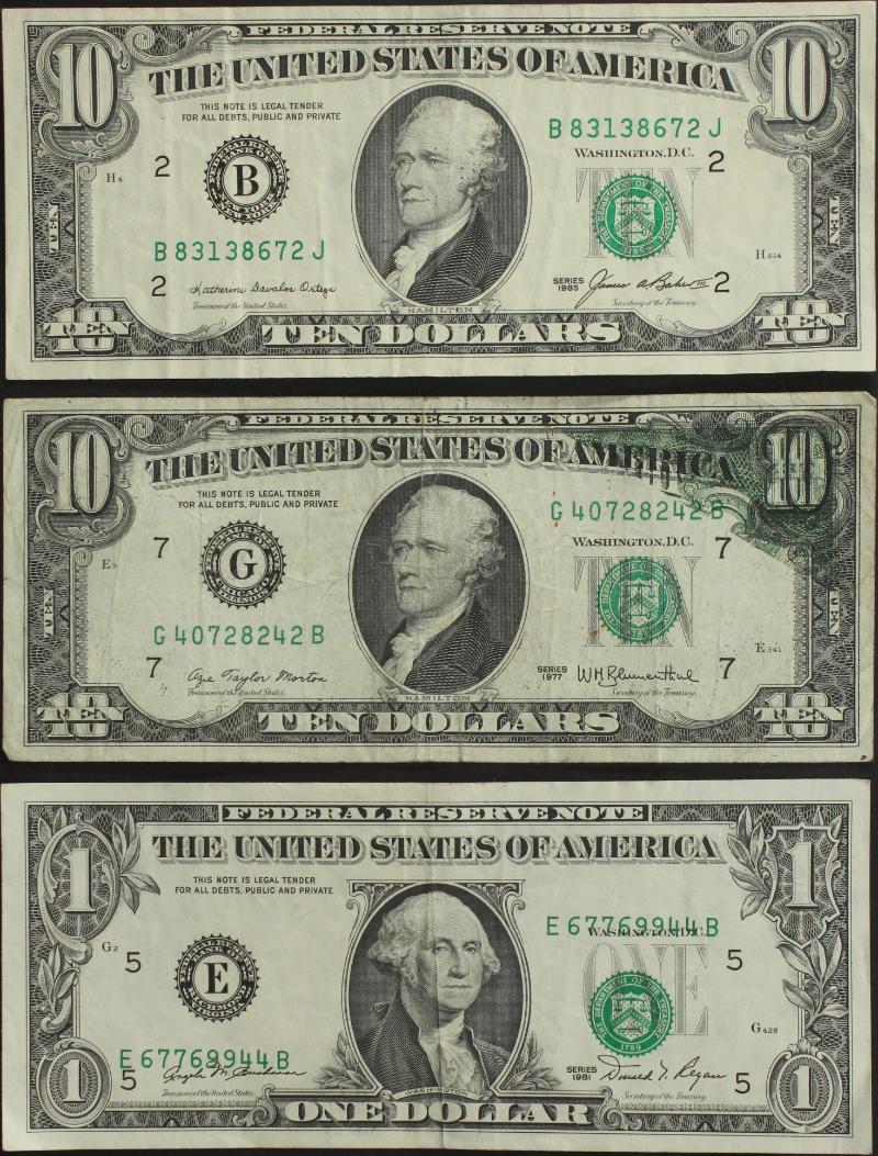 (7) Error Notes incl a significant ink smear on a 1985 $10, a print alignment error on a 1981 $1, (4) complete offset transfers, and (1) partial offset transfer on 1977 $1 and 1977 thru 1981 $10s. Offsets are more lightly impressed than the previous transfer error lots. Inspection recommende