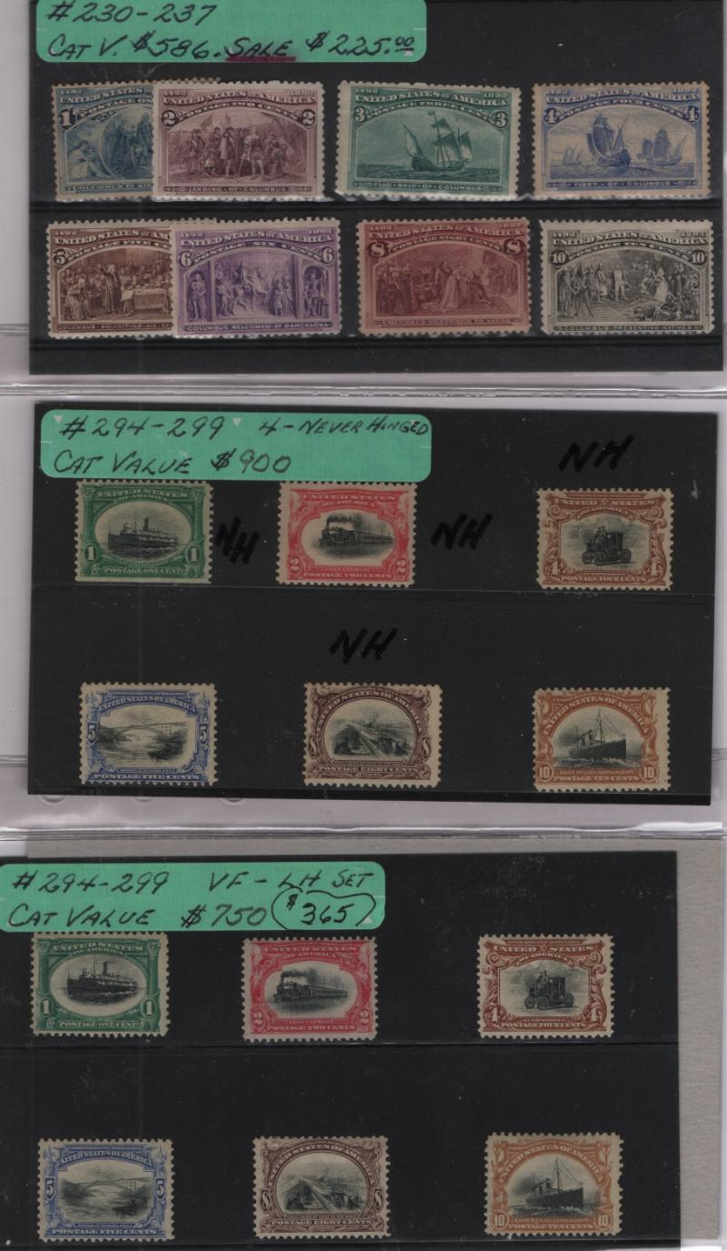 Show Display cards (13) incl Unused: #230-37 LH, 294-99 (5¢ & 10¢ H, rest NH), 294-99 H (10¢ pulled perf), 371 NH arrow Blk, 373 NH Blk, 692-701 LH, 803-31 NH (2), 839-51, 1030-53 LH (2), C1-6 H; Used: 1053 Blk; gen F-VF