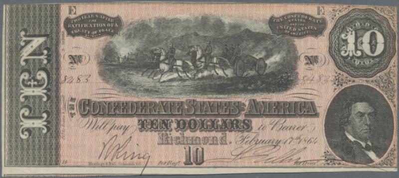 10 Dollars, February 17th 1864, P.68, very nice condition with a few minor spots and tiny creases right border, Condition: XF/XF+.