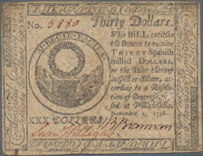 Continental Currency – United Colonies 30 Dollars November 2nd 1776, P.S154, great condition, taken from a very old collection and previously mounted with tiny parts of thinning paper at the corners and a few folds, Condition: F.