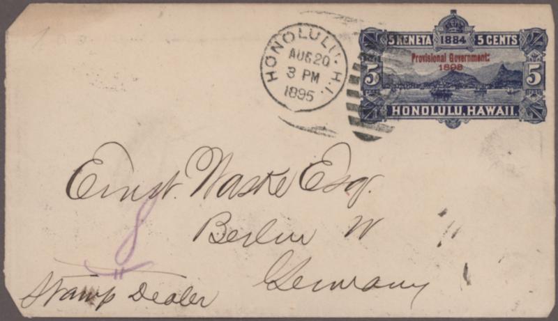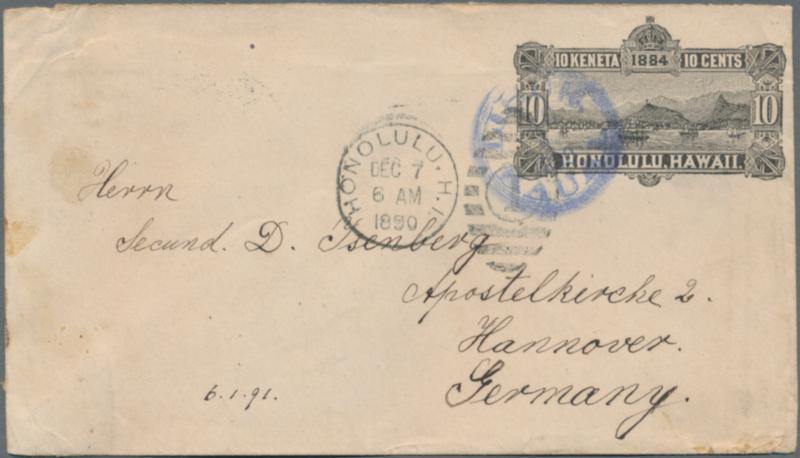 1884 postal stationery envelope 10c. black used from Lihue to Germany via Honolulu in 1890, cancelled by blue c.d.s. "LIHUE KAUAI/DEC/6/1890", with Honolulu transit duplex on face, San Francisco transit dater and Hannover arrival c.d.s. on