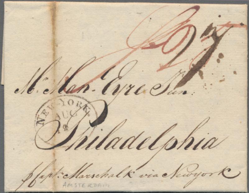 1802, incoming lettersheet from Amsterdam 4 June, addressed to Philadelphia with oval "NEW-YORK AUG 12" on front, endorsed "p Capt.Marschalk via New York" (Ship Orlando). Rated for a letter 90-150 miles at 12½c. x2 for double weight, original