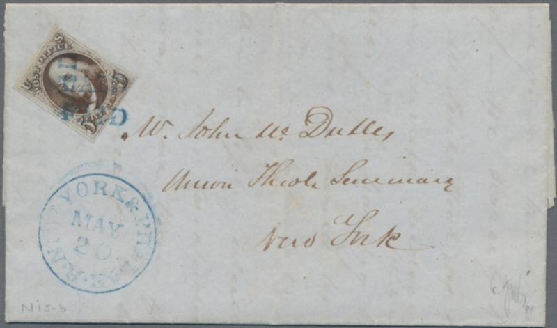 1847 'Franklin' 5c. deep brown used on entire from Philadelphia to New York by Rail Road, tied by three strikes of "PAID" h/s in blue, Rail Road c.d.s. "NEW YORK & PHILA R.R./MAY 20" in blue alongside, dated inside '18 May 1848'. A fresh and fine stamp