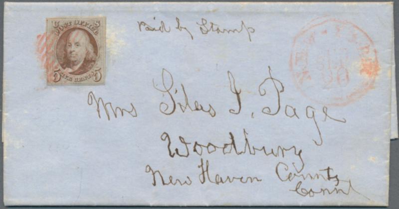 1847 'Franklin' 5c. red-brown tied by RED SQUARE GRID to entire letter from New York to Woodbury, New Haven, Conn., dated inside 'New York Sep 20/47', with "NEW-YORK/SEP/20" c.d.s. in red on front. A fine stamp and an attractive cancellation. Frajola, M