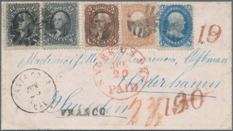 1861 Definitives 1c. blue, 3c. rose, 5c. brown and two singles of 12c. black used as extraordinary four-colour-franking on white envelope from Santa Cruz, Cal. to Söderhamn, Sweden via New York and Bremen, Germany, with respective datestamps and charge