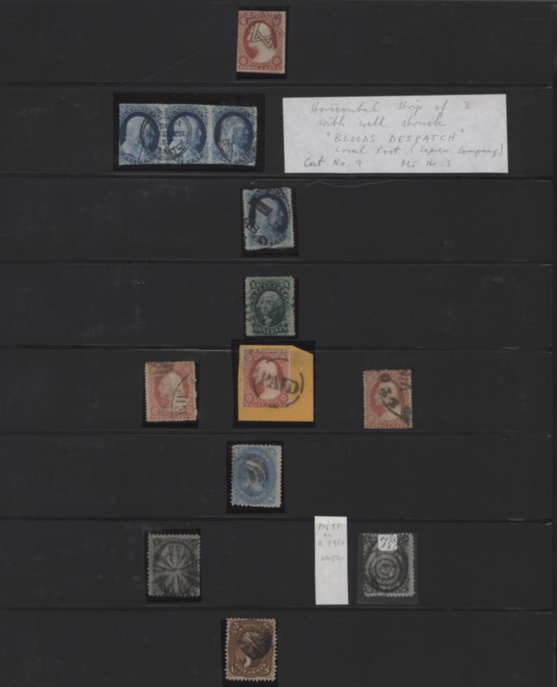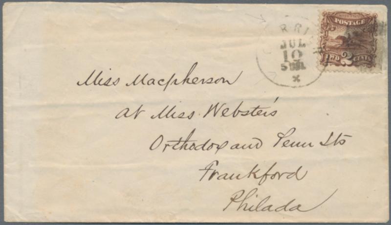 1869 'Landscape' 2c. and 3c. each used as single franking on cover, i.e. 2c. brown on cover to Frankford, Philadelphia cancelled by VERY RARE "CARRIER/JUL/10/5 DEL" c.d.s. and mute h/s, plus 3c. ultramarine on cover to Xenia, Ohio tied by four-ring h/s