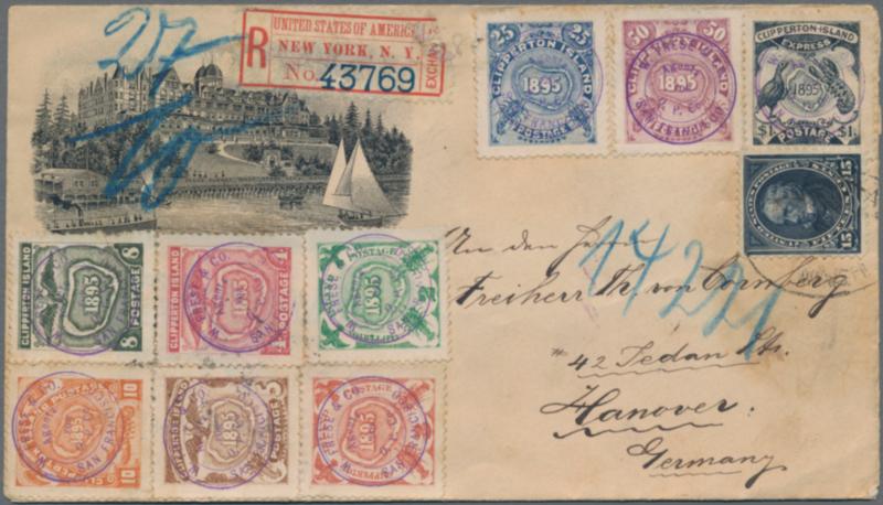 1895 "CLIPPERTON ISLAND": COMPLETE set of ten from 1c. to $1 of Clipperton Island stamps (1c. on back) used in combination with US 1894 15c. indigo on illustrated envelope as registered mail to Hannover, Germany via Tacoma, Was