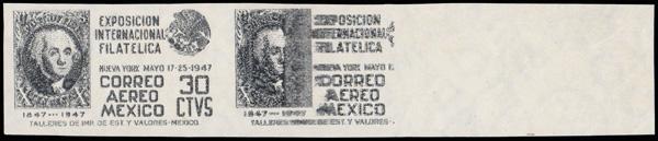 Airmail, 1947 CIPEX, 30c gray black, imperforate (Scott C168a var.), right sheet margin horizontal pair, the right stamp only partially printed, o.g., never hinged, Extremely Fine. An exceedingly rare Stamps-On-Stamps topical variety. Scott $325 as normal.
