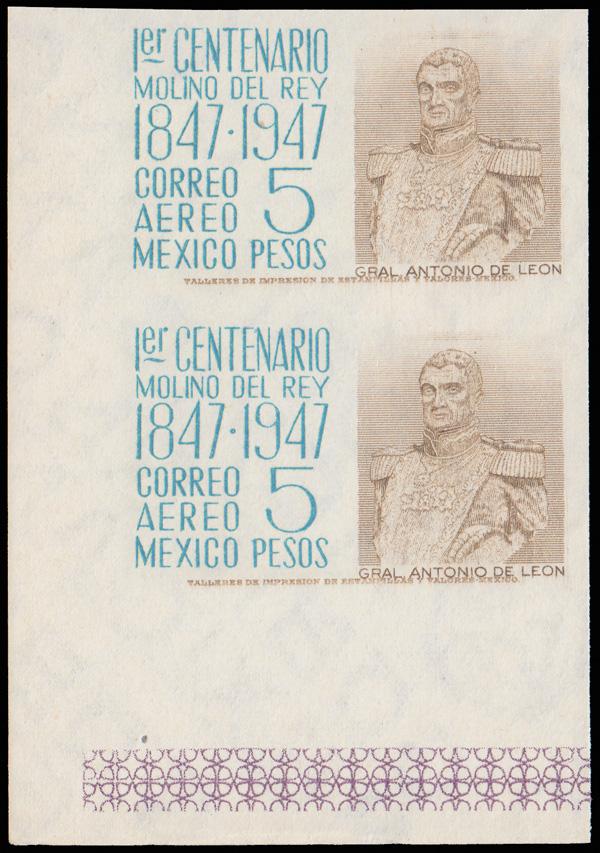 Airmail, 1947, 5p Molina del Rey, imperforate (Scott C184a), vertical pair with full lower left corner sheet margin, o.g., never hinged, Extremely Fine. Scott $600.