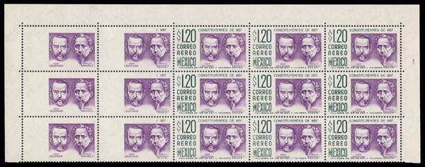 Airmail, 1964, 1.20p dark green & purple, dark green omitted (Scott C289 var.), a transitional block of 15 stamps - the top three rows from a full sheet of 50; the first stamp in each row is totally devoid of the green inscriptions; the second stamp in each row has on