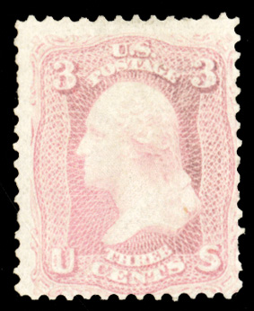 (64) 1861 3c pink, h.r., usual centering and irregular perforations, tiny corner crease, otherwise a fine example of this rare shade, with 1972 and 2003 PFCs, the former without mention of the crease, cat. $14,000