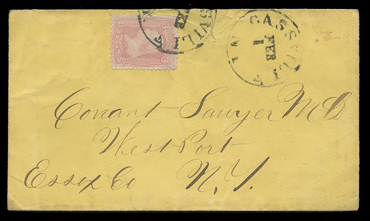(64) 1861 3c pink, single used on cover from Cassville to West Port, backflap and a small portion of the back repaired but fine appearing overall, with 2006 PFC, cat. value $700