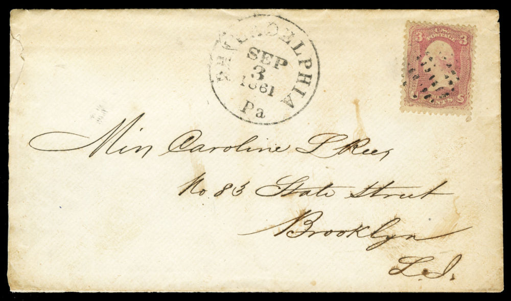 (64a) 1861 3c pigeon blood pink, single on cover (contents enclosed) from Philadelphia to Brooklyn, cover with small tear at left, stamp well centered and fine, with 2001 PFC, cat. $5,000