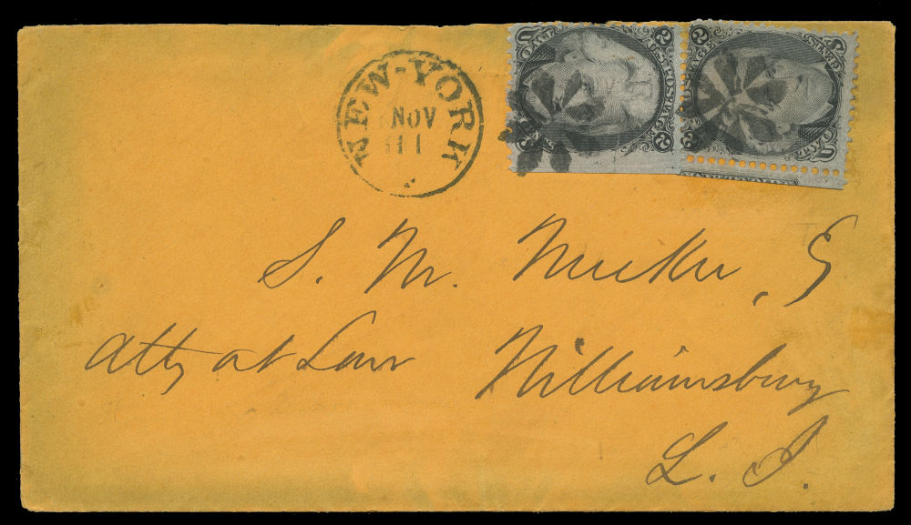(73) 1861 2c black singles, one with right sheet margin (with pre-use crease visible) and the other with partially captured imprint, used by black fancy cancels on cover paying the double weight drop rate from New York City to an attorney in Williamsburg, a fine-v.f. use of this popular issue on cov