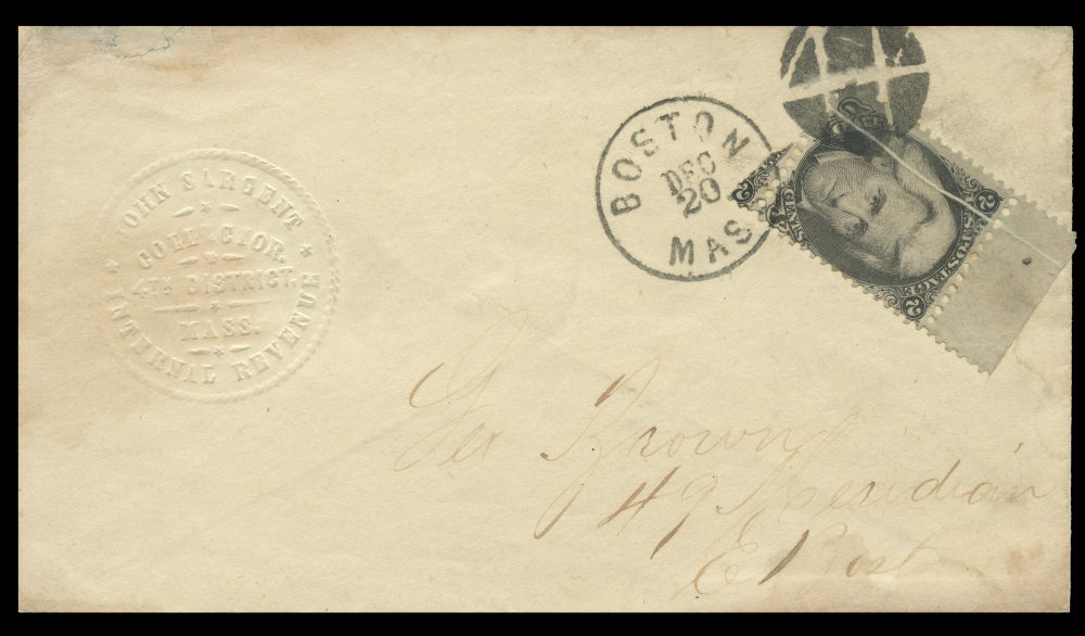 (73) 1861 2c black, sheet margin single exhibiting a pre-printing paper fold, tied by black cork and Dec 20 Boston, Mass. datestamp on cover paying the drop rate within Boston, fine