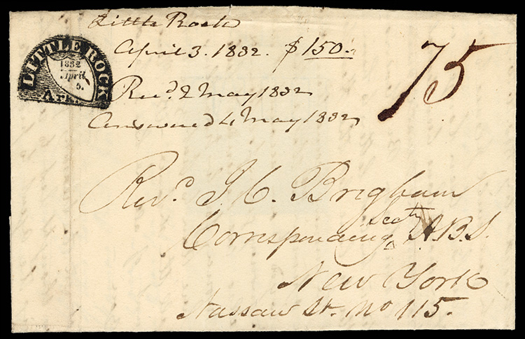 1835 (5 Apr) large part of a FL with a perfect strike of the "Little Rock, Ark." Fancy Shield in Semi-circle datestamp which shows every detail of the design, manuscript "75" rate, endorsed "$150" and addressed to Rev. J. C. Brigham, Corresponding Secretary American Bible Society, 115 Nassau Street