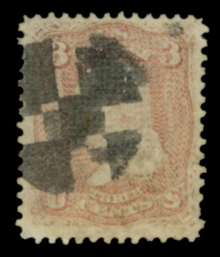 (83) 1867 3c rose, C.Grill, black cork cancel, nice color, wide margins, clearly defined grill, fine, with 2000 PFC for a pair from which this originated, cat. $1,150