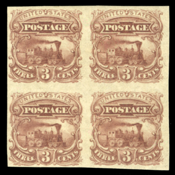 (114-E) 1869 3c Locomotive, imperforate block of four in red brown, essay on gummed stamp paper, without grill, l.h. and n.h., v.f.