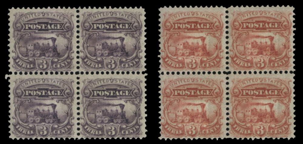 (114-E6d) 1869 3c Locomotive, two different perforated and gummed essays on stamp paper, with grill, blocks of four, l.h. and n.h., fine-v.f.
