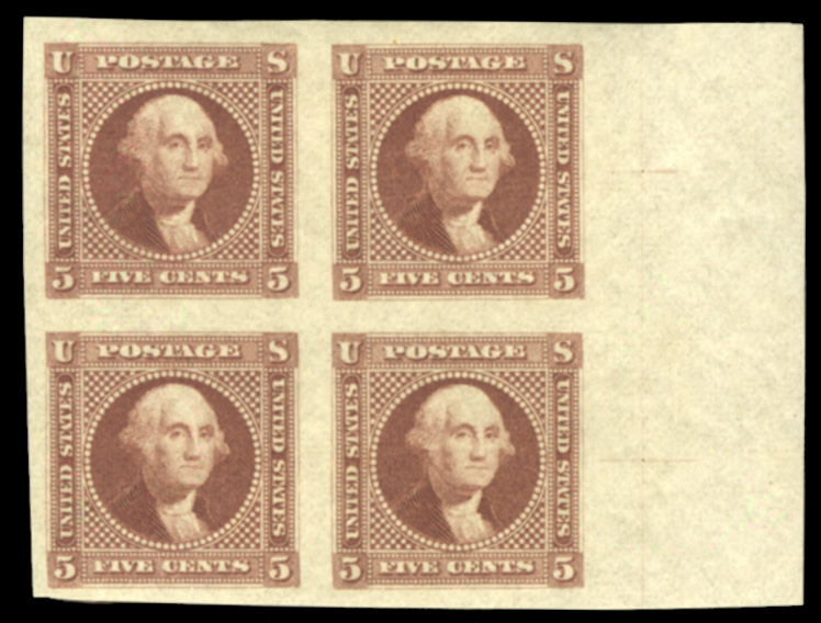 (115E) 1869 6c Washington, imperforate block of four in red brown, essay on gummed stamp paper, without grill, l.h. and n.h., v.f.