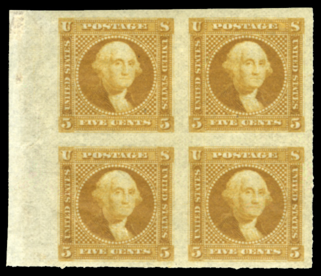 (115E) 1869 6c Washington, imperforate block of four in yellow brown, essay on gummed stamp paper, without grill, l.h. and n.h., v.f.