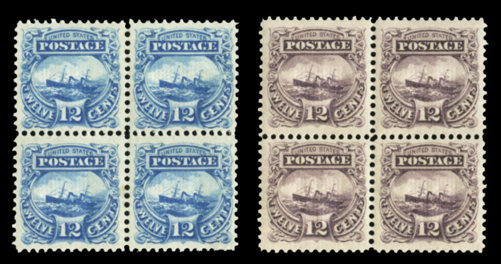 (117E) 1869 12c S.S. Adriatic, two perforated and gummed blocks of four, essays on gummed stamp paper, with grill, mostly n.h., fresh and v.f.