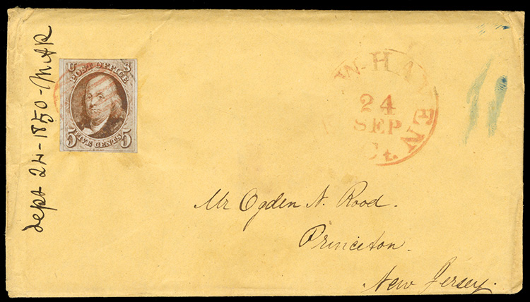 (1) 1847 5c red brown, margins all around, light black grid cancel, v.f., re-used on 1850 cover (with contents), tied by red grids, sent from New Haven to Princeton, N.J., fine and uncommon example of early postal fraud