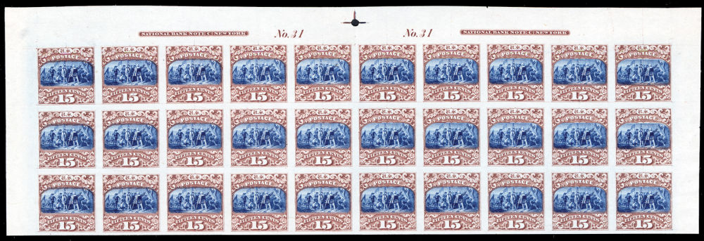 (119P3) 1869 15c brown & blue, Plate Proof on india, top sheet margin pane of 30, Imprint and Plate No.31 (2), incredibly fresh, rich colors, two tiny thin spots in margin at upper left, well away from the stamps, magnificent showpiece, possibly the largest known multiple of this value (catalogued a