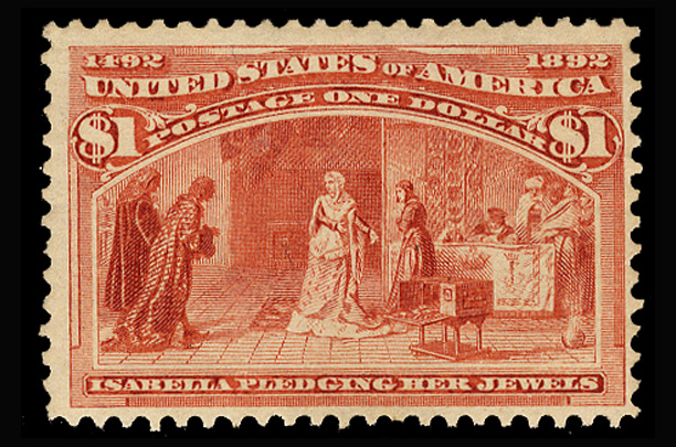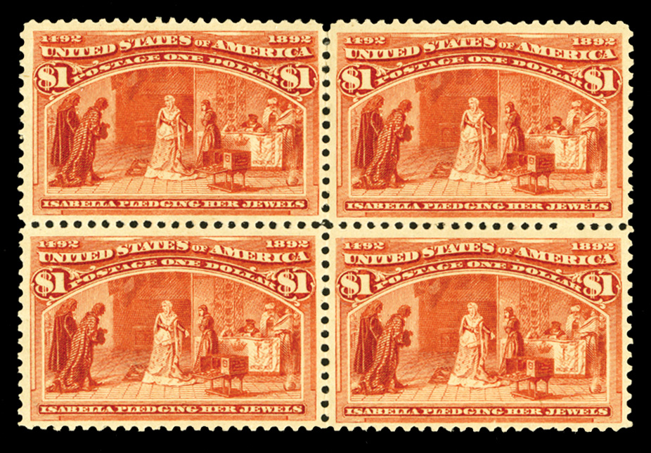 (241) 1893 $1 salmon, block of four, exceptionally well centered, h.r. and minor perf. strengthening, fresh and v.f.,cat. $4,500